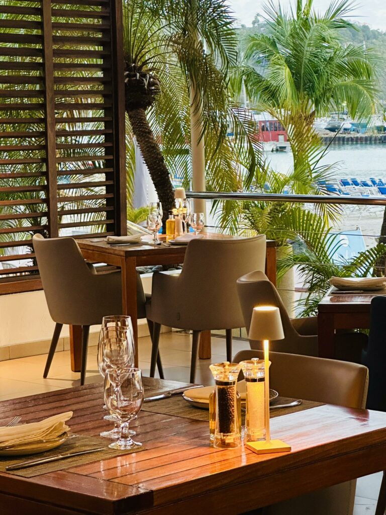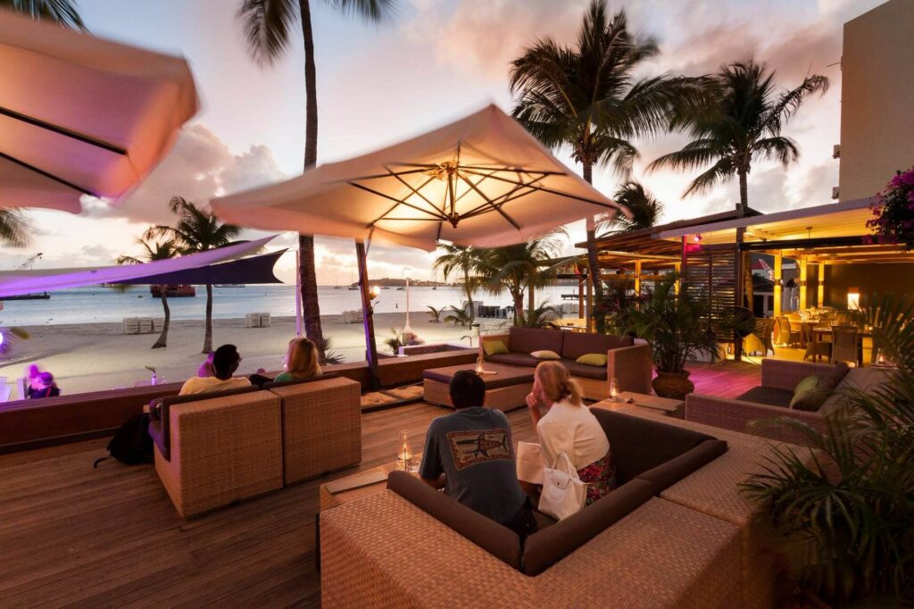 The restaurant overlooks the Great Bay beach with its calm water and departing cruiseships at night and has an eclectic and vibrant ambiance. It is considered one of the best restaurants on St. Maarten The menu is inviting and the Chef creates daily specials using fresh ingredients that are locally farmed and flown in. One of the signature dishes is the Fruits de Mer. A decadent presentation with grilled lobster, King crab, Ahi tuna, shrimp, salmon, oysters and clams. All served with French fries and side salads. A must try!